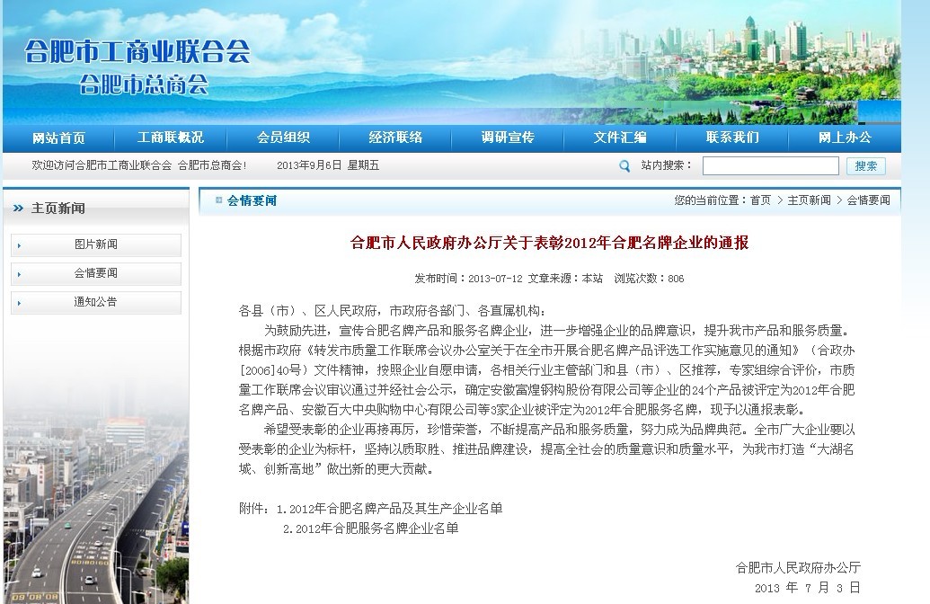 以下為《合肥市人民政府辦公廳關于表彰2012年合肥名牌企業的通報》(合政辦秘〔2013〕60號)具體內容(摘自工商聯合會網站)