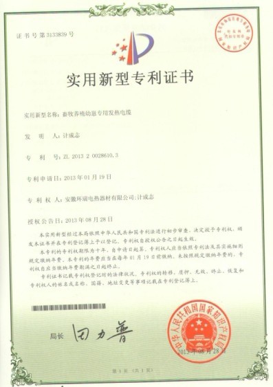 環(huán)瑞自成立研發(fā)小組至科學(xué)技術(shù)中心期間,通過獨立開發(fā),引進國外先進的生產(chǎn)工藝與技術(shù),與合肥工業(yè)大學(xué)建立長期合作關(guān)系,聘請相關(guān)專業(yè)的技術(shù)專家等模式,投入大量的人力物力。我司以安全,實用性能為目標(biāo),通過改變發(fā)熱電纜結(jié)構(gòu)與原材料,已研發(fā)成功。目前已獲得了關(guān)于畜牧養(yǎng)殖專用的國家專利證書,研發(fā)出耐高溫,耐磨的雙層絕緣的發(fā)熱電纜獲得了2項國家專利證書。包括之間我司獲得的“混凝土養(yǎng)護發(fā)熱電纜”“天溝融雪專用發(fā)熱電纜”,截止,我司已獲得了5項關(guān)于發(fā)熱電纜的國家專利證書,我司發(fā)熱電纜的生產(chǎn)技術(shù)已達到國內(nèi)先進。共計19項專利。新的專利證書已下達。