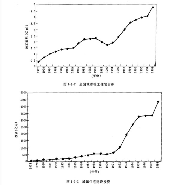 我國地域廣闊.人口眾多.房屋建筑規模巨大。其中住宅建設約占居住建筑的92%.而住宅,是世界各國都面臨的社會問題。“人人享有適當的住房”已成為聯合國第二次人居大會所提出的戰略目標。改革開放以來.從1979年到1998年底.我國城鄉新建住宅建筑面積158億 ㎡其中城鎮住宅宅 約35億 ㎡.農村作宅約123億MI.全國城市人均居住面積從3. 6 ㎡增加到9.3  ㎡(圖一1一1).竣 工面積從3 752萬 ㎡增加到47 600萬 ㎡(圖1-1-2).城鎮住宅建設投資從39.21億元增加到4  310.81億元(圖1-1 3). 1.7億戶遷入新居."八五"期間共完成城市住宅建設投資8 543億元.竣工 住宅10.5億 ㎡,僅1995年住宅竣工面積3.3億 ㎡.比“七五”期間增長76%.九五.期間計劃建設 住宅12億 ㎡,比“八五”期間增長14.3%.到1999年底。我國設城市加為668個.當年全國城市新 建房屋竣工面積4.362 5億㎡.其中住宅2.971 6億㎡.當年底.全國住宅總使用面積為30.505 2億 ㎡.總居住面積為21.011 2億㎡.人均使用面積達到14.2 ㎡.人均居住面積達到9. 8 ㎡分別比上 年增長0.6和0. 5 ㎡.居民生活條件大有改善。住宅建設量大面廣.至今仍呈上升趨勢.而且這個 上升趨勢還將持續20-30年。由此看出,我國住宅建設正處于快速發展階段.不僅是中國歷史上的 最高峰.也是世界上任何一個國家所不可比擬的。