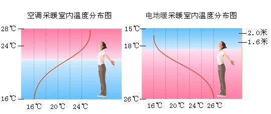(2)從溫度梯度看:電采暖供暖是通過低溫輻射,加熱室內(nèi)密實(shí)物體,然后令室內(nèi)空氣均勻升溫,其溫度梯度自下而上遞減,讓人感受足暖頭涼;而傳統(tǒng)散熱暖氣片和空調(diào)的溫度梯度則剛好相反,是自上而下遞減的,久之會讓人感受頭暈不適。